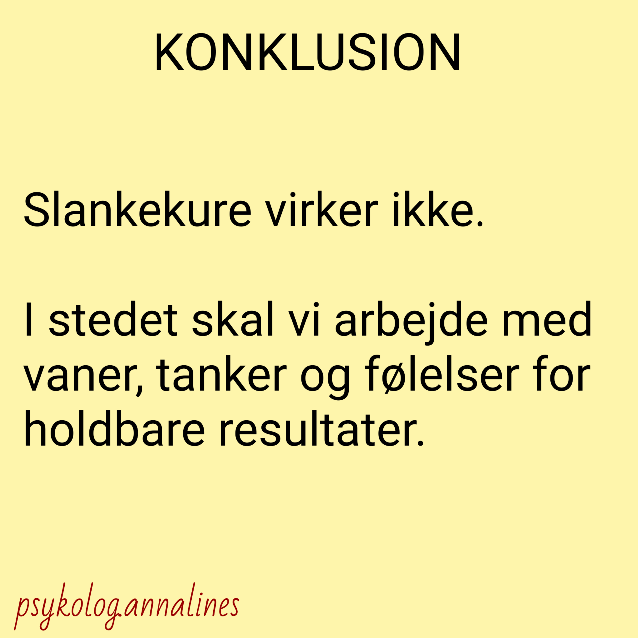 I stedet for at fokusere på kilo og slankekure, vi alligevel kun kan overholde i korte perioder, skal vi arbejde med mønstre, vaner, tanker og følelser. Alt det, der gør, at vi overhovedet spiser. Alt det, der gør, at vi falder i, tager kiloene på igen eller har udviklet et skævt forhold til mad.